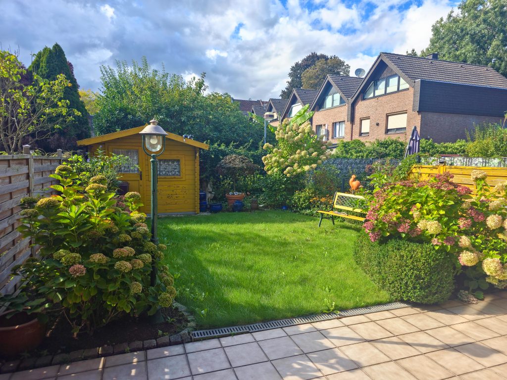 Im Erdgeschoss empfängt Sie eine helle Diele mit Gäste-WC. Von hier aus gelangen Sie in die separate Küche sowie in den großzügigen Wohn- und Essbereich, der durch seine großen Fensterflächen viel Tageslicht bietet. Der direkte Zugang auf die Terrasse und in den liebevoll angelegten Garten macht das Herzstück des Hauses zu einem Ort, an dem sich der Alltag und die Freizeit harmonisch verbinden. Ein praktisches Gartenhaus bietet zusätzlichen Stauraum für Geräte und Freizeitutensilien.